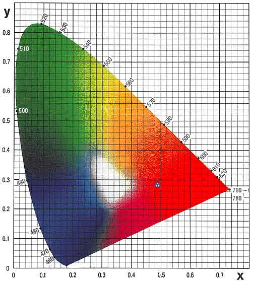 The CIE Chromacity Diagram (below) shows the colors that are visible to a person with normal color vision. When discussing the color of an LED, the wavelength (as seen on the edges of the "shark fin" below) of the light emitted is normally referenced for colors in the rainbow. Certain special LED colors (such as White or Pink) cannot be defined by a wavelength so they are specified with a chromacity coordinate.